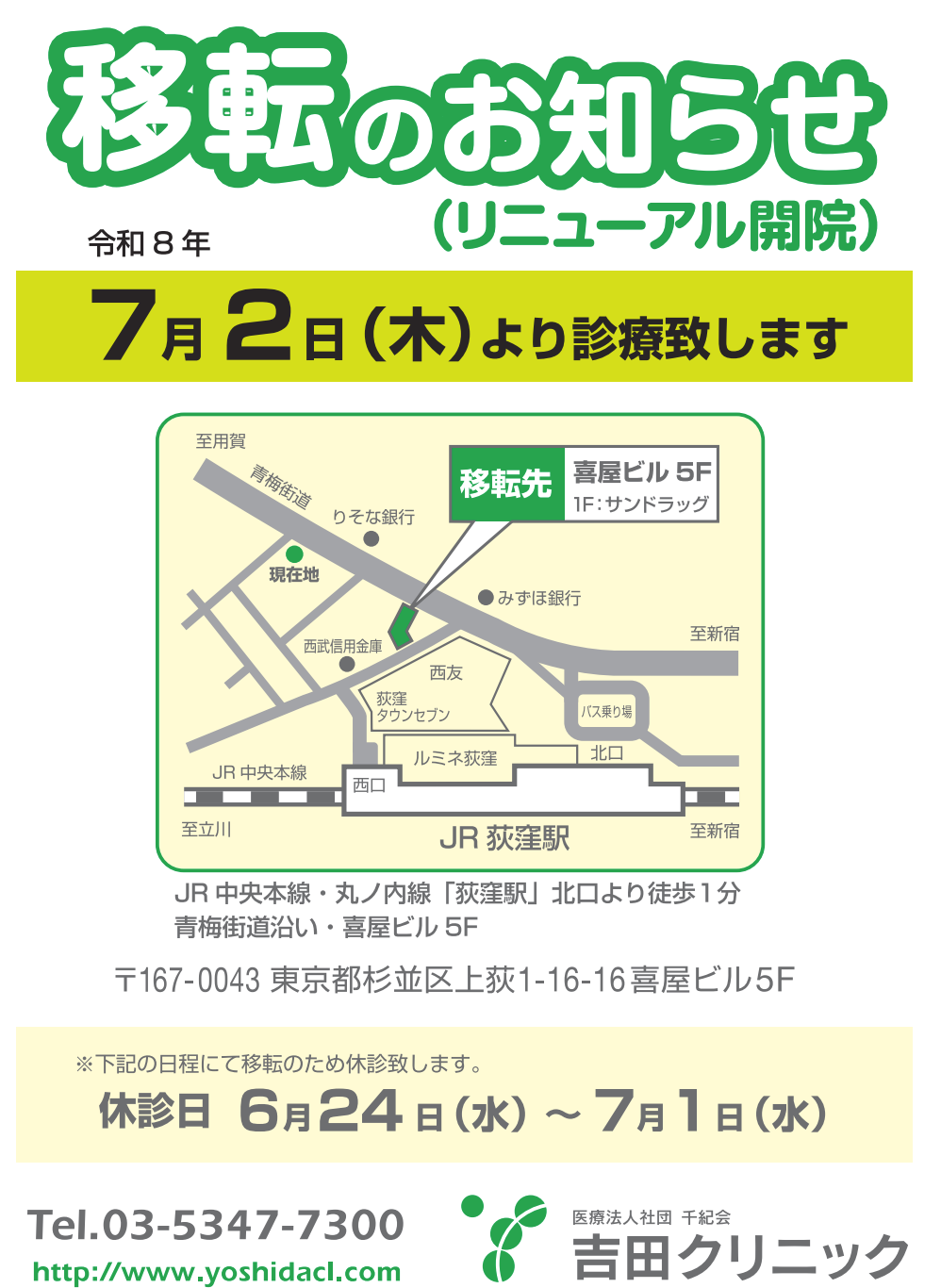 杉並区荻窪駅利用が便利な内科、整形外科、皮膚科、小児科 の診療・治療をしているクリニックです。 皆様のホームドクターとして地域に根付き、かつ自身の専門 分野である内科、整形外科においては、一般大病院にも劣ら ない医療レベルを保つことを目標に日々診療しております。 どうぞお気軽にご来院ご相談ください。